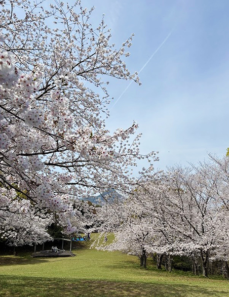 令和8年4月2日、本社近くの干尽公園において、社内お花見を行いました。直近の1週間は、やや不安定な天候が続いていましたが、この日は見事な晴天に包まれ、桜も満開を迎えていました。